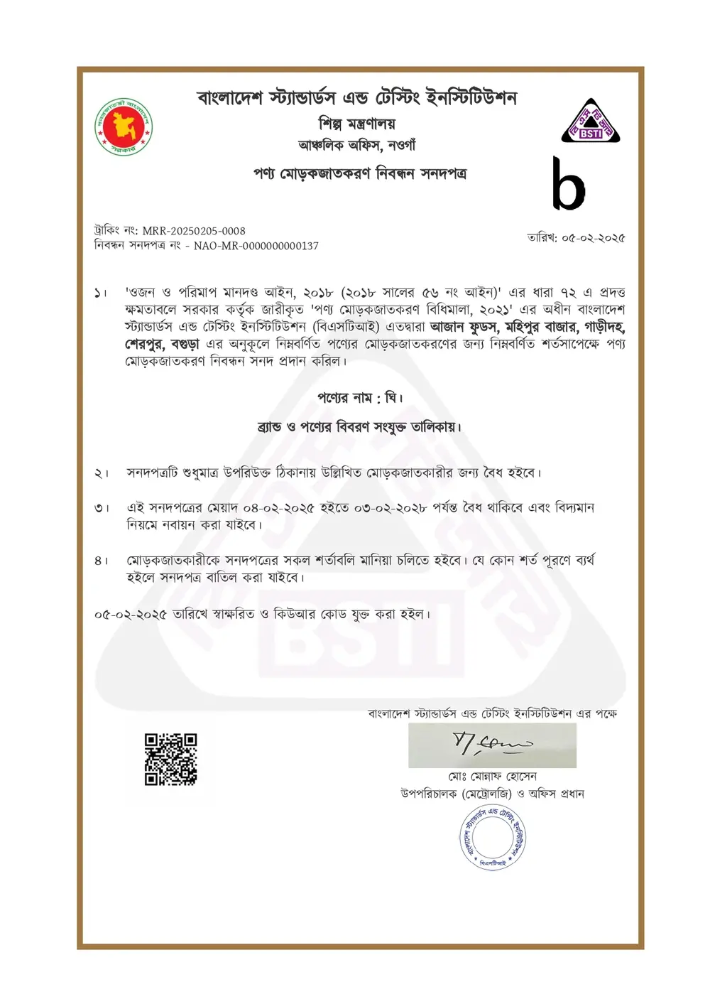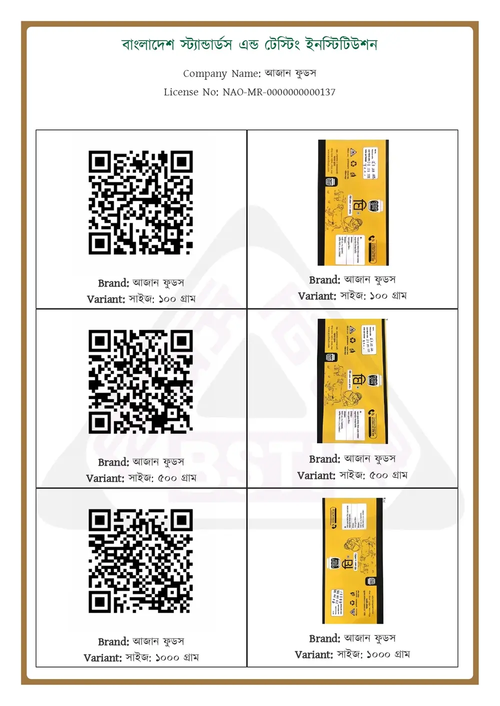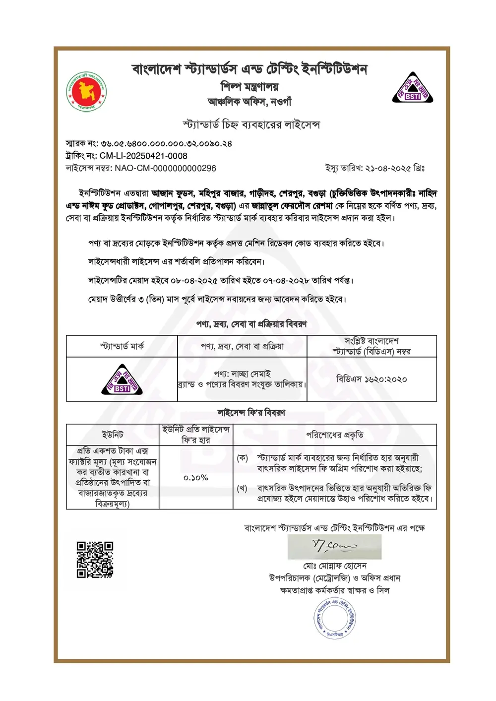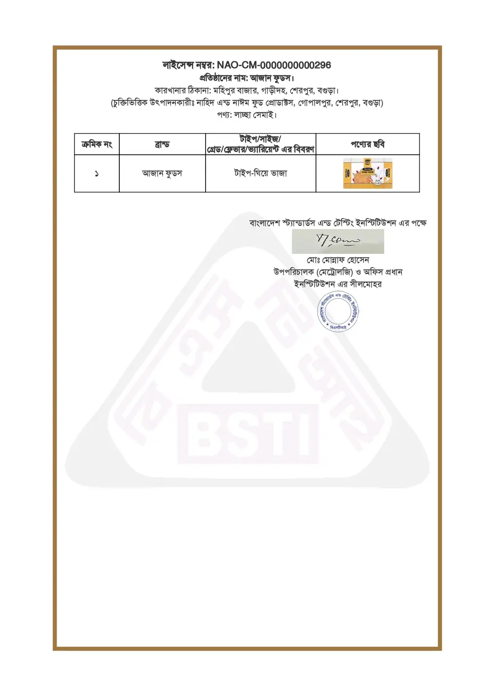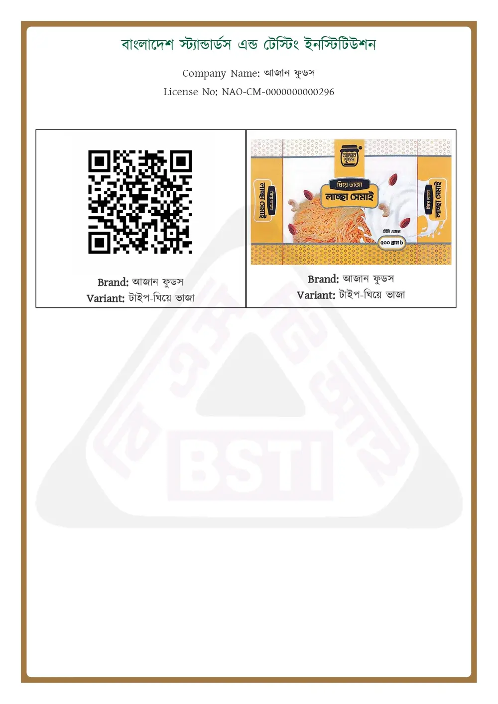 লাচ্চা সেমাই এর BSTI লাইসেন্স