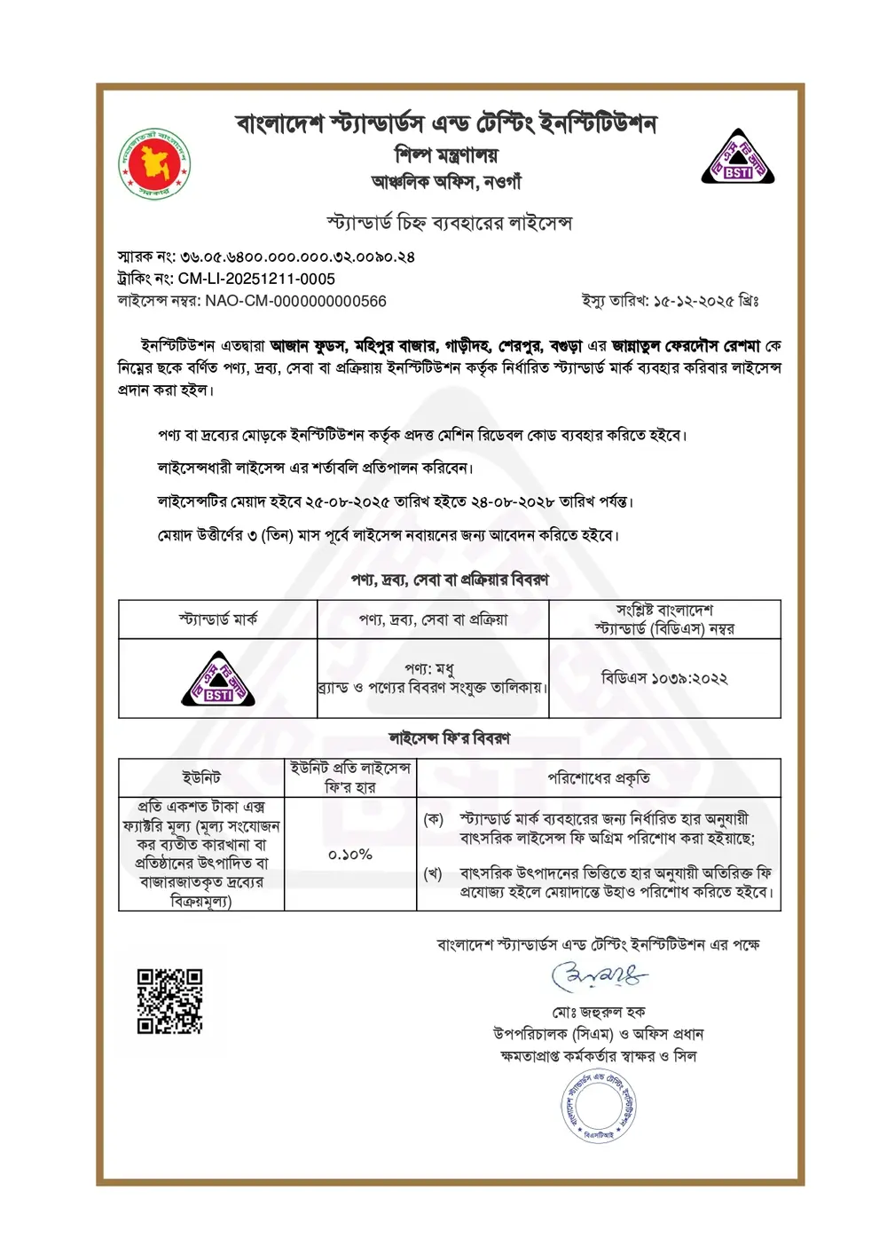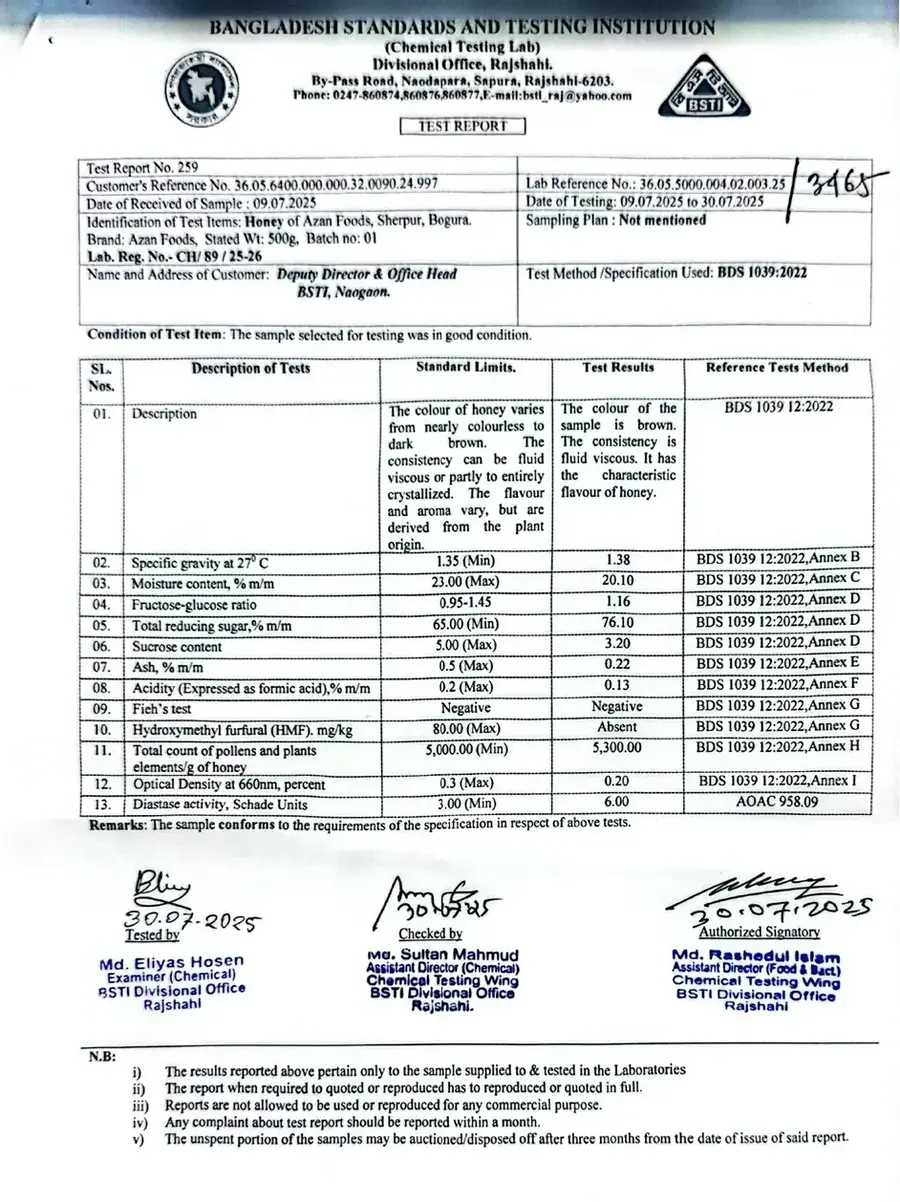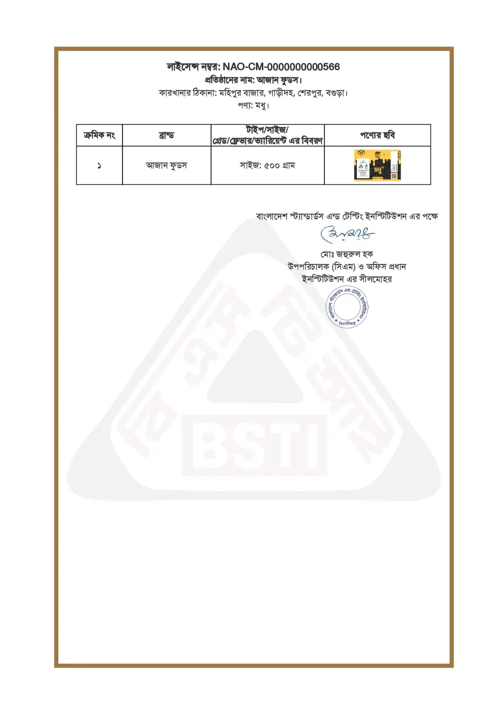 মধুর BSTI লাইসেন্স এবং Lab Test রিপোর্ট